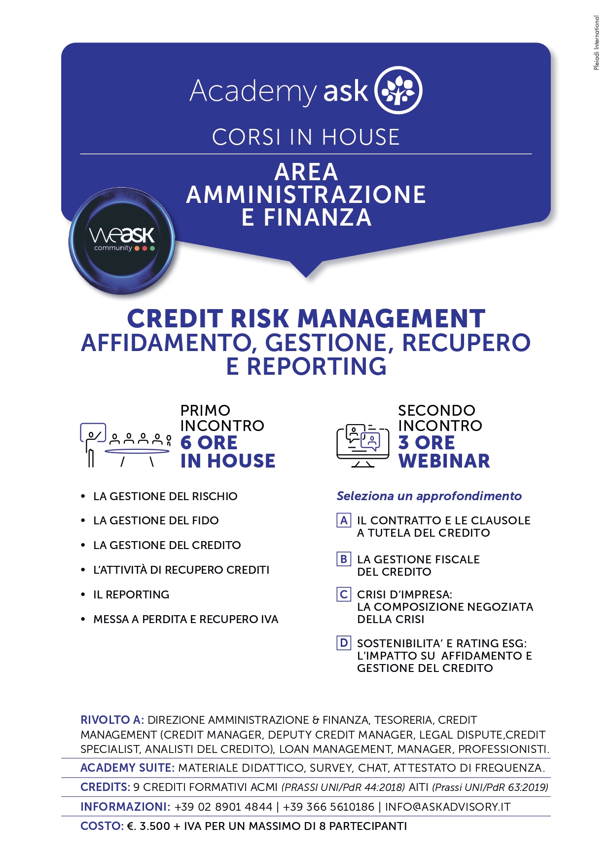 Oltre alle sessioni in aula, il format Corsi In House prevede 3 ore di webinar in addendum. Queste possono essere dedicate alle tematiche ed esigenze emerse durante il corso stesso: i nostri formatori saranno a disposizione per valutare insieme come meglio strutturare questo ulteriore momento di formazione.